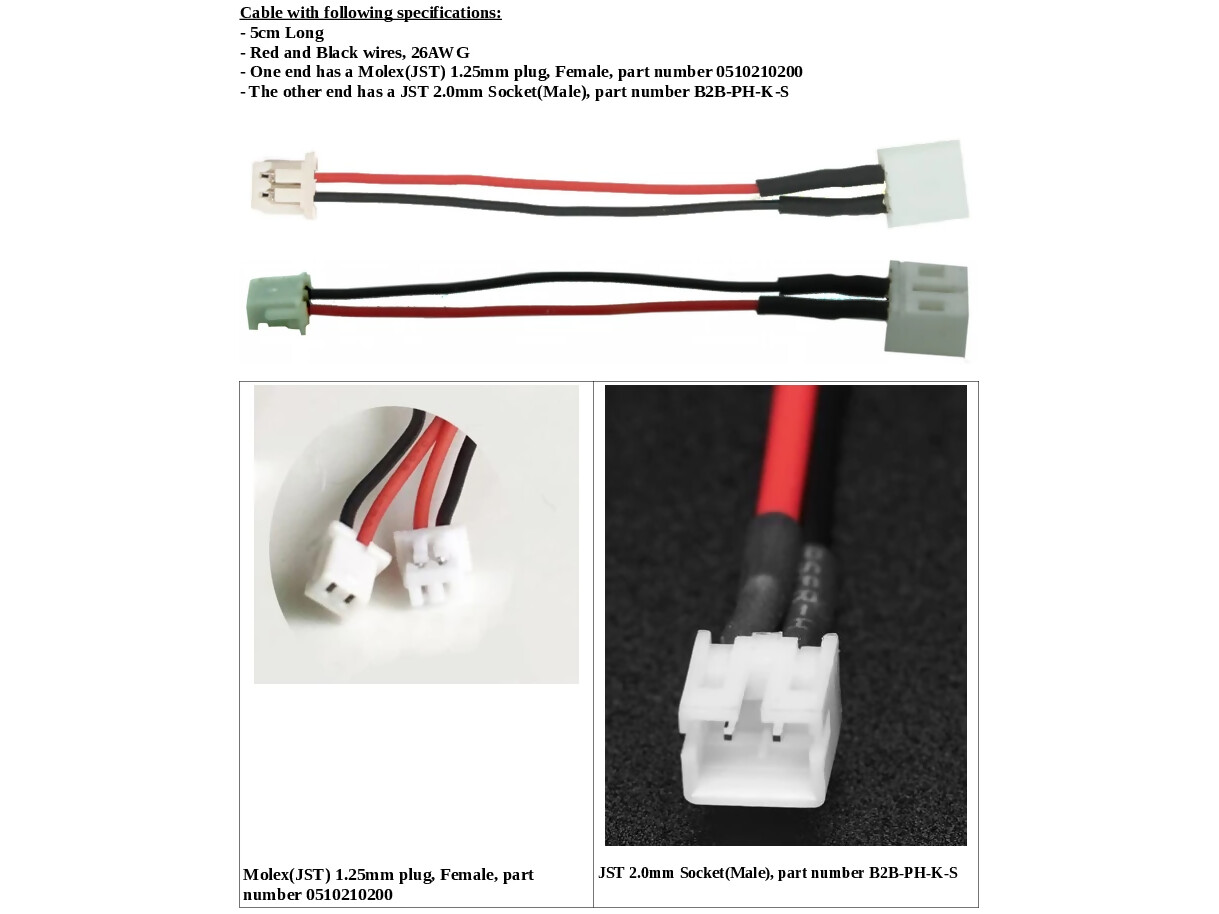 Converter cable to convert a 2 pin JST 2mm connector to a JST(Molex) 1.25mm connector. Both these connectors are often used with LiPo and other batteries for portable devices. Like remote controls, dashcams, GPS trackers, hobby and other small devices.