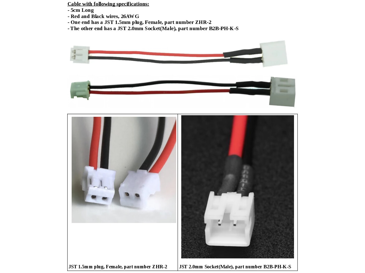 Converter cable to convert a 2 pin JST 2mm connector to a JST 1.5mm connector. Both these connectors are often used with LiPo and other batteries for portable devices. Like remote controls, dashcams, GPS trackers, hobby and other small devices.